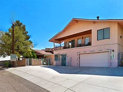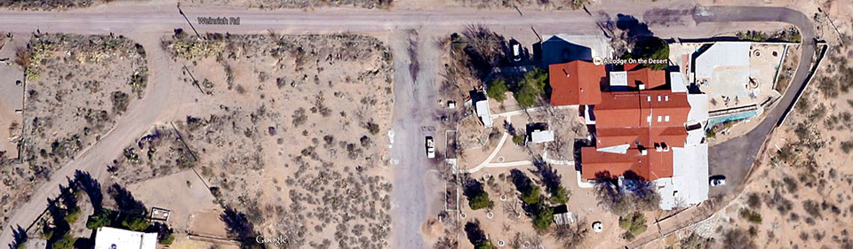 Between US70E Mile Markers 142 and 143, you will see Weinrich Rd. Turn South, past the KOA RV Park, go 1 mile, up and down two hills, then a hard left back to the east, which will bring you to the dead end, where we are located. The Lodge is a large, tri-level, red roofed, pink stucco building with turquoise wrought iron and trim. Park on the concrete area in front of the gate.